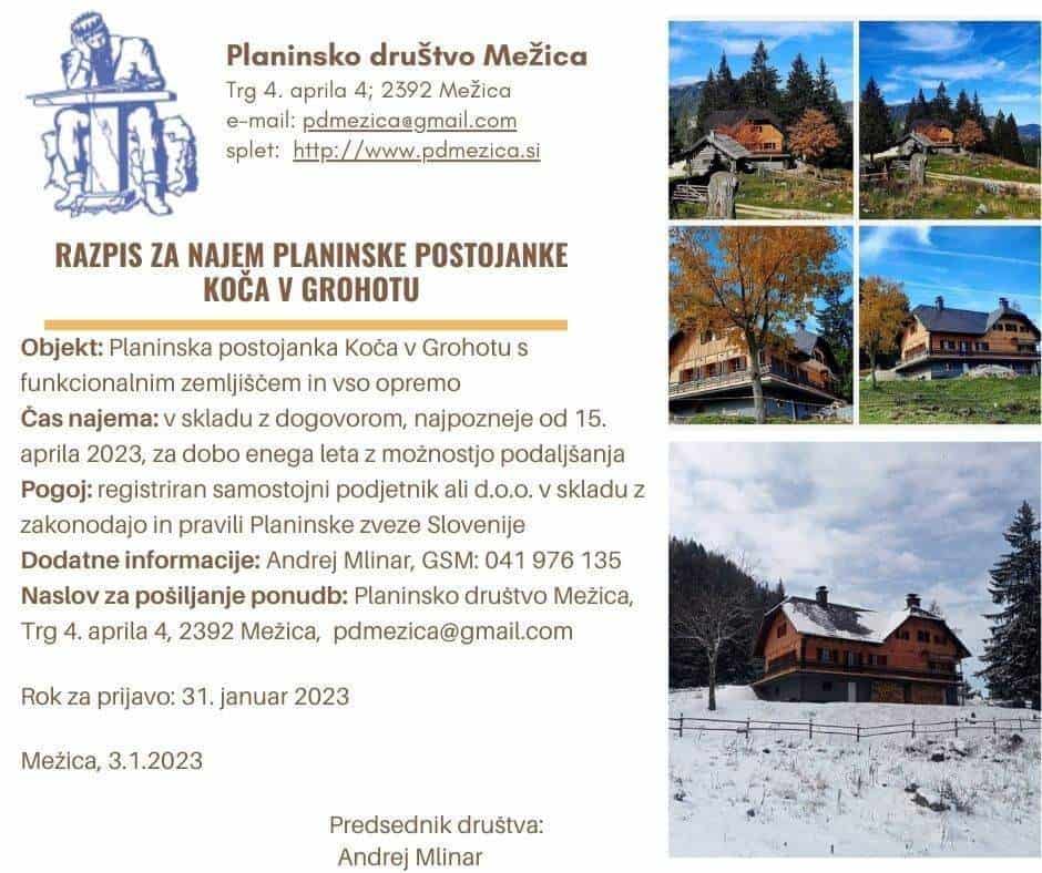 Dodatne informacije dobite pri Andreju Mlinarju, kontakt: 041 976 135; naslov za pošiljanje ponudb: Planinsko društvo Mežica, Trg 4. aprila 4, 2392 Mežica ali na e-naslov: pdmezica@gmail.com, rok za prijavo je 31. januar 2023.