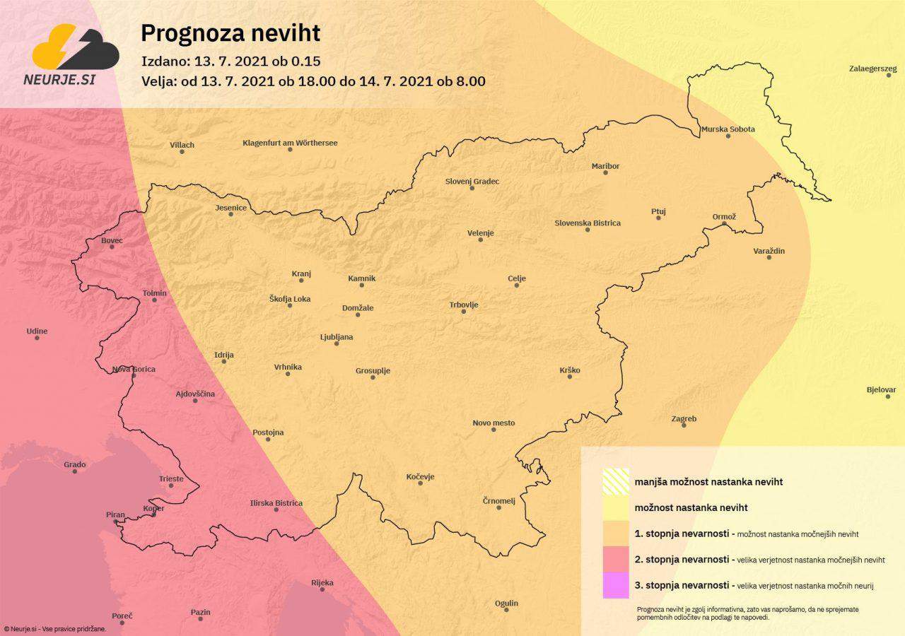 Zvečer so ob prihodu vremenske fronte zlasti na zahodu države možne močnejše nevihte z intenzivnimi (lahko tudi dolgotrajnimi) nalivi in močnimi sunki vetra, ni izključen tudi pojav toče. Na Primorskem bodo izpolnjeni pogoji za razvoj krajevnih neurij, saj bo razpoložljive konvektivne potencialne energije nad severnim Jadranom tudi več kot 2.500 J/kg (v notranjosti do 1.200 J/kg) v kombinaciji s striženjem vetra v plasti 0-6 km od 20 do 30 m/s. Visoke vrednosti, tudi nad 40 mm, bo v obalnih predelih dosegel kazalnik razpoložljive padavinske vode v ozračju, kar nakazuje na možnost močnih nalivov z veliko količino padavin v kratkem času.