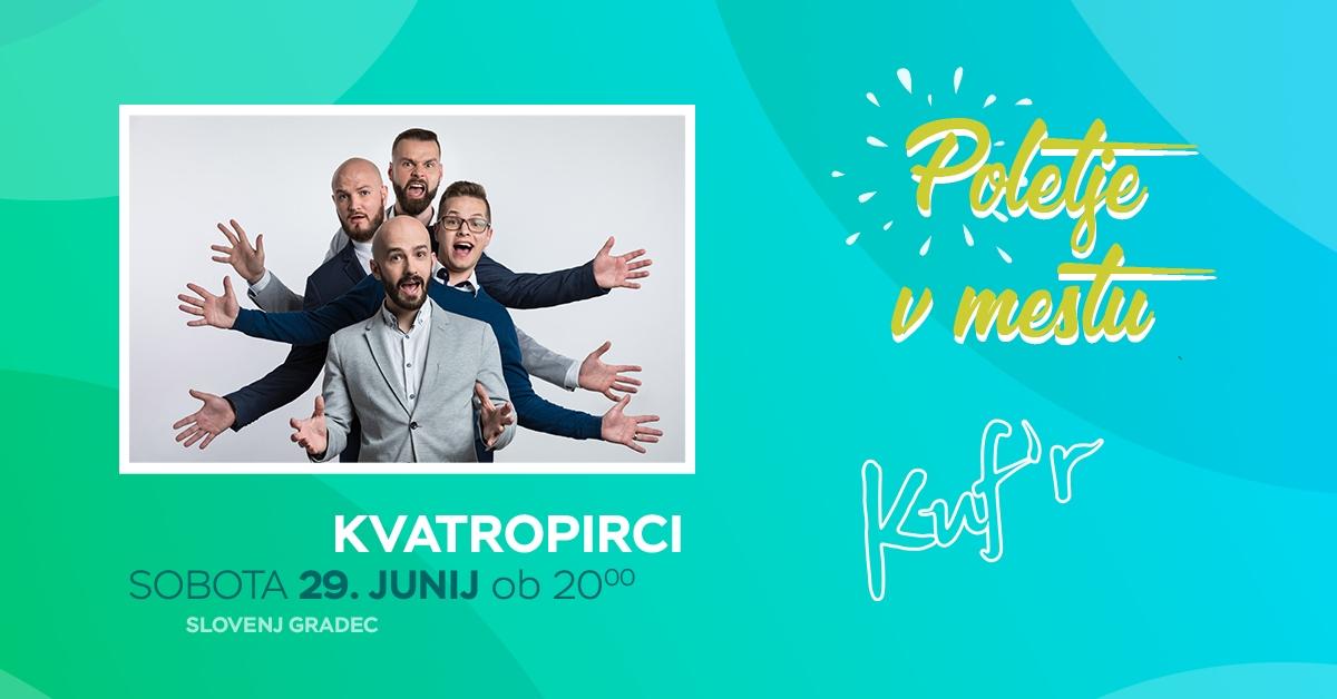 Že to soboto, 29. junija, vabljeni, da se v okviru Slovenjgraškega poletja udeležite velike zabave v Piceriji in pivnici Kuf’r, kjer boste lahko uživali ob štiriglasnem petju in zvokih kitare skupine Kvatropirci. Za člane Kvartopircev pravijo: "Kvatropirci zagotovo veliko obetajo, še posebej pa se jih vedno razveselijo predstavnice nežnejšega spola, saj fantje poleg glasbenega talenta tudi odlično izgledajo." Zato ste to soboto v Kuf’ru še posebej dobrodošle vse dame, dekleta, mame in žene ..., da se prepričate, ali to res drži, hkrati pa preizkusite ponudbo picerije in pivnice, v kateri se preverjeno najde za vsakogar kaj.