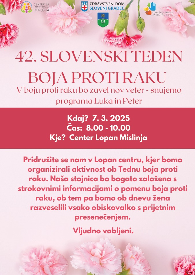 V okviru 42. Slovenskega tedna boja proti raku bo v petek, 7. marca 2025, od 8.00 do 10.00 v Centru Lopan v Mislinji potekala posebna zdravstvena aktivnost, namenjena ozaveščanju o pomenu preprečevanja in zgodnjega odkrivanja raka.