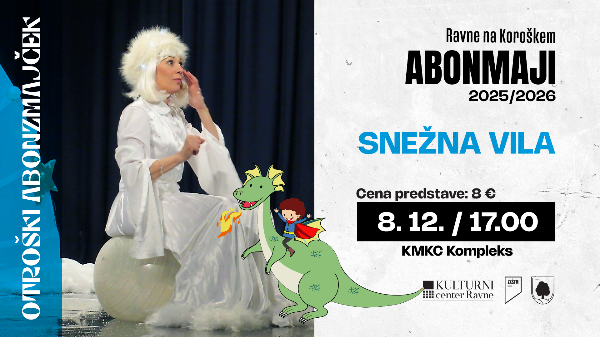Praznično, decembrsko vzdušje je že zavzelo Ravne na Koroškem in predstave in dogodki v okviru Čarobnega decembra se kar vrstijo. Otroški Abonzmajček pa bo skupaj s Snežno vilo priklical tudi nekaj snežink.