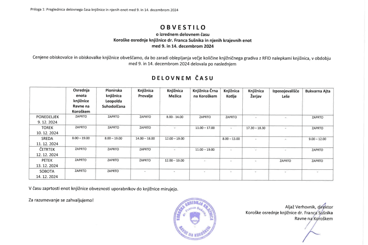 Koroška osrednja knjižnica dr. Franca Sušnika in njene krajevne enote obveščajo obiskovalce, da bo zaradi tehničnih del – nameščanja RFID nalepk na knjižnično gradivo – spremenjen delovni čas knjižnice in njenih enot.