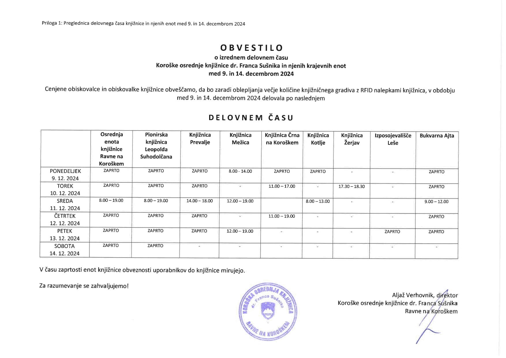 Izredni delovni čas bo trajal od ponedeljka, 9. decembra, do sobote, 14. decembra 2024.