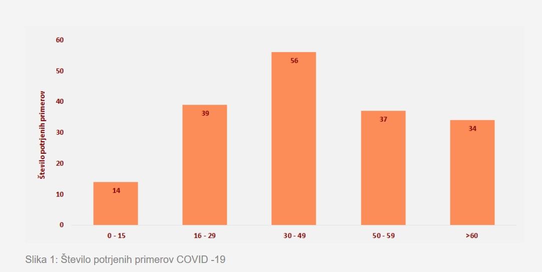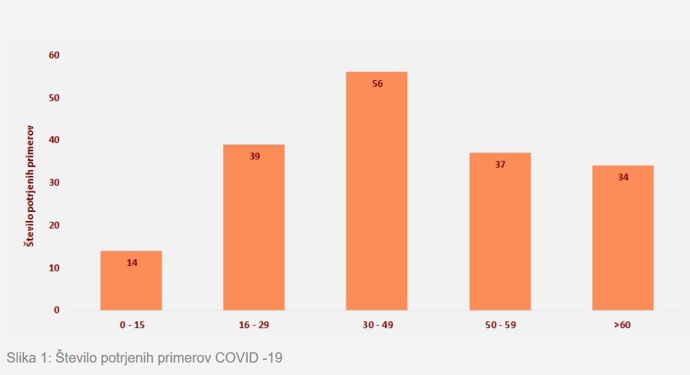 Gledano po starostnih skupinah je bilo do 15. leta 14 okuženih, med 16. in 29. letom 39, med 30. in 49. letom 56, med 50. in 59. letom pa 37. V starostni kategoriji nad 60 let je bilo 34 primerov potrjenih okužb.
