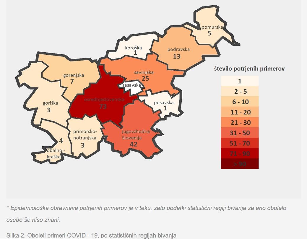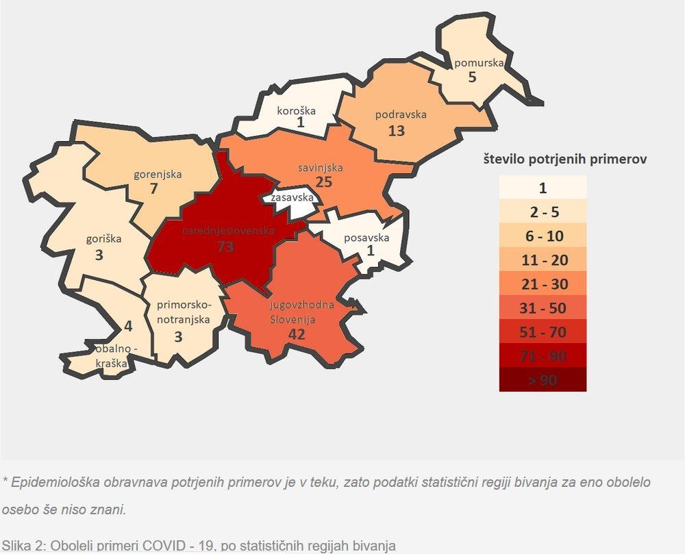 Število potrjenih okužb se je v 24 urah povečalo za 40. Po regijah ljubljanski in novomeški sledita celjska (27 potrjenih okužb) in mariborska (13 okužb), je vlada sporočila prek Twitterja. Tudi ti podatki so do 11. ure.