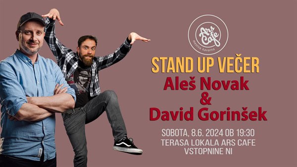 Ne zamudite priložnosti za sprostitev in zabavo z dvema izjemnima komikoma. Pridružite se nam v Ars Cafe mestni kavarni in uživajte v Stand up večeru, ki vam bo še dolgo ostal v spominu. Vstop je prost, zato povabite prijatelje in družino ter se skupaj nasmejte do solz!