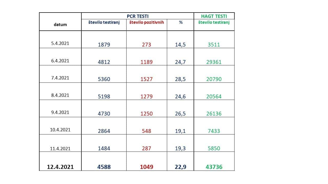 Včeraj je bilo opravljenih 4.588 PCR testiranj in 43.736 hitrih antigenskih testov. S PCR testi je bilo včeraj potrjenih 1049 novih okužb. 7 dnevno povprečje okužb znaša kar 1014 in je bistveno višje kot smo poročali včeraj, ko je znašalo 903.