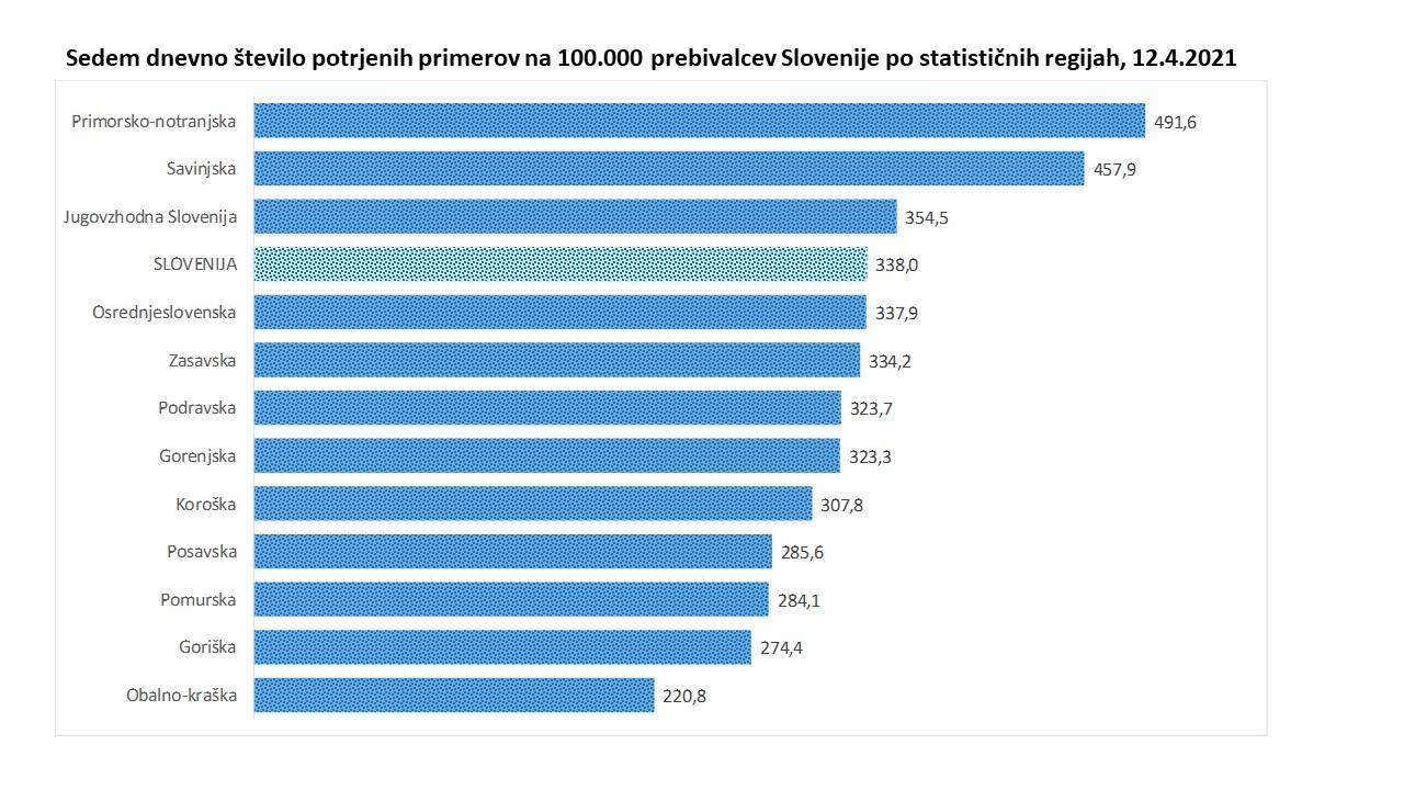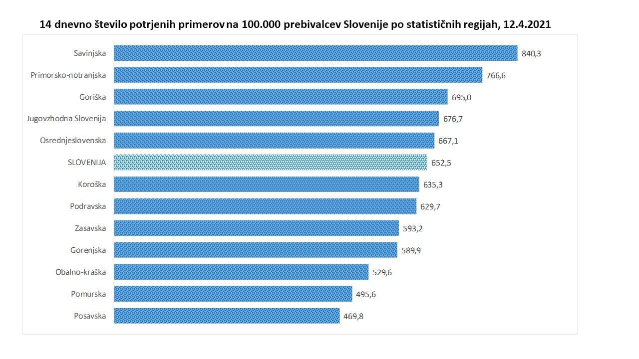 Najvišjo 14-dnevno incidenco imata Savinjska (840) in Primorsko-notranjska regija (767), najnižji incidenci pa sta še naprej v pomurski (496) in posavski regiji (470). 7-dnevna incidenca na nivoju države znaša 338, včeraj 301. 14-dnevna incidenca na Koroškem znaša 635,3, dan pred tem 649,4. 7-dnevna pa danes znaša 307,8, kar je več kot dan pred tem, ko je znašala 278,1. Vendar ostajata obe incidenci pod slovenskim povprečjem.