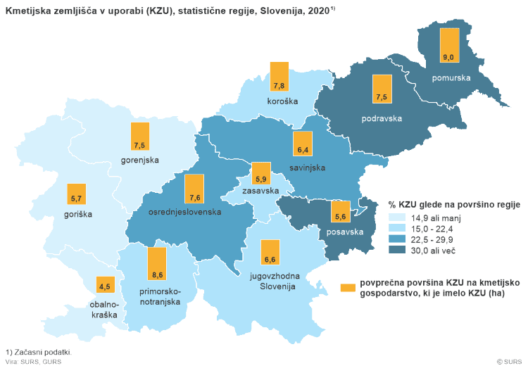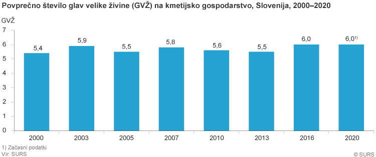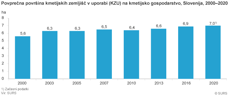 Povprečno kmetijsko gospodarstvo je večje kot pred desetletjem. Povprečno kmetijsko gospodarstvo v Sloveniji v letu 2020 je po začasnih podatkih imelo v uporabi 7,0 ha kmetijskih zemljišč (skupni pašniki niso vključeni) in redilo 6,0 glave velike živine (GVŽ). Povprečna površina kmetijskih zemljišč v uporabi (KZU) je bila za 0,6 ha večja kot pred desetimi leti in za 1,4 ha večja kot pred dvajsetimi leti. Povprečno število GVŽ pa je bilo za 0,4 večje kot pred desetimi in za 0,6 večje kot pred dvajsetimi leti.