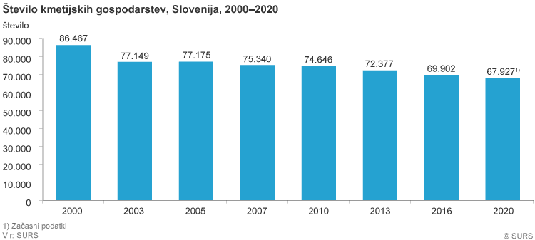 Število kmetijskih gospodarstev v Sloveniji se zmanjšuje. Po prvih začasnih podatkih iz Popisa kmetijstva 2020 imamo v Sloveniji 67.927 kmetijskih gospodarstev ali za 9 % manj kot v 2010 (74.646) in za 21 % manj kot v 2000 (86.467).