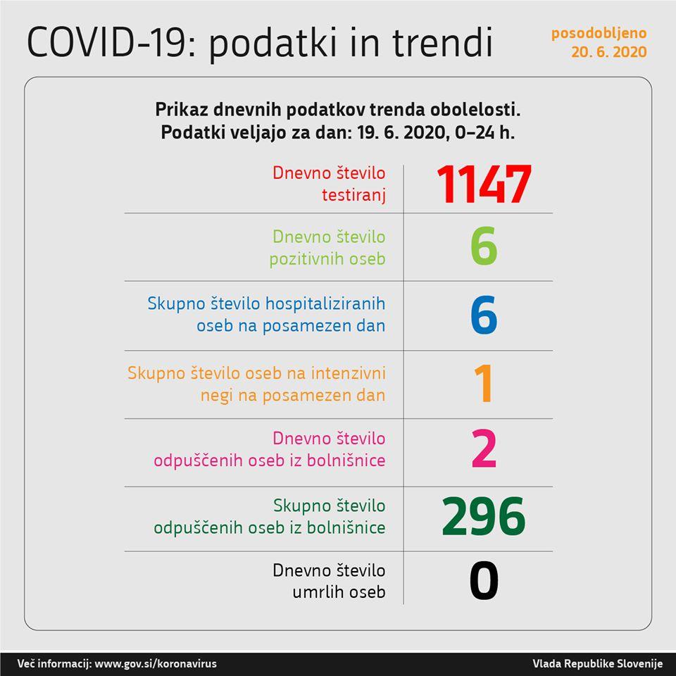 Trend obolelosti s koronavirusom v Sloveniji in podatki za dan 19. 6. 2020 (00:00–24:00):