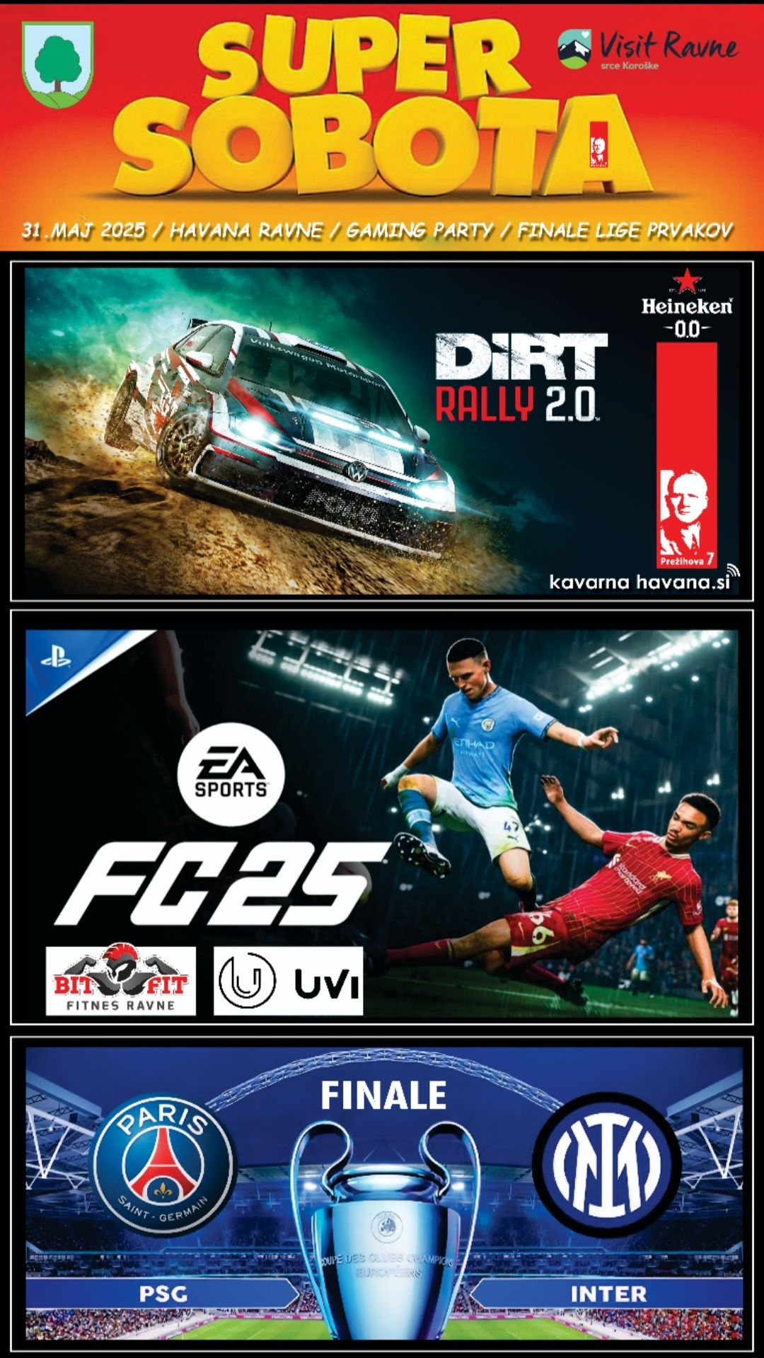 V soboto, 31. maja 2025, se bodo Ravne na Koroškem spremenile v pravo stičišče zabave, športa in dobrega srca! V priljubljenem lokalu Havana se bo odvijal edinstven dogodek Super sobota – Gaming Party, ki bo dosegel vrhunec z ogledom finala Lige prvakov. A ta dan ne bo namenjen le igram in navijanju – pomemben poudarek bo na dobrodelnosti.