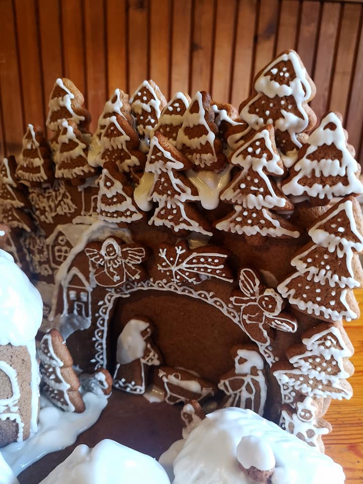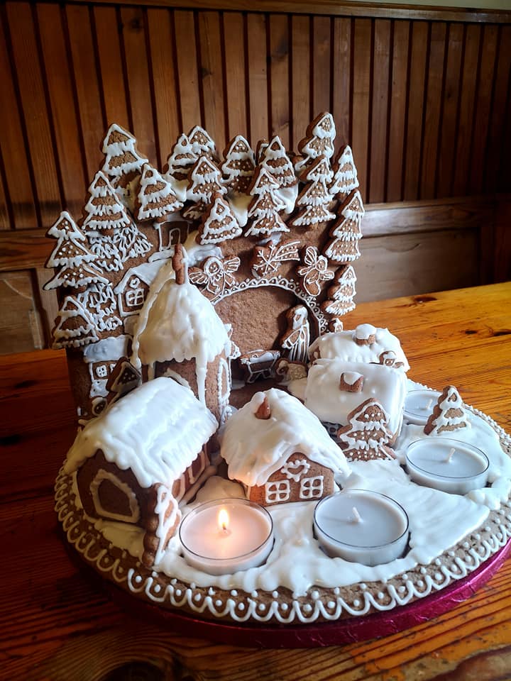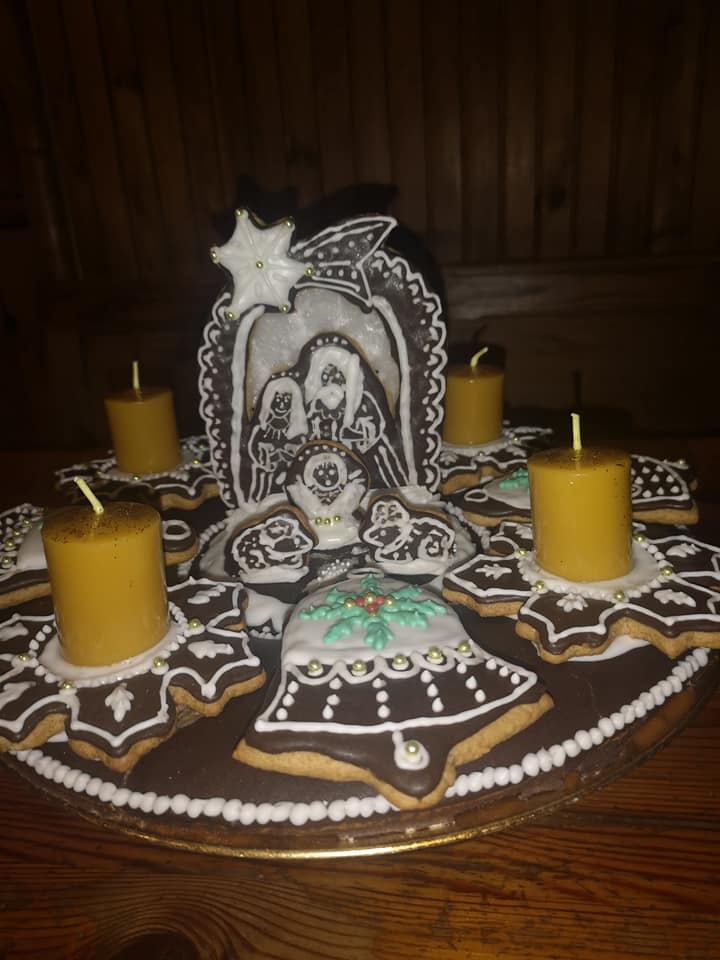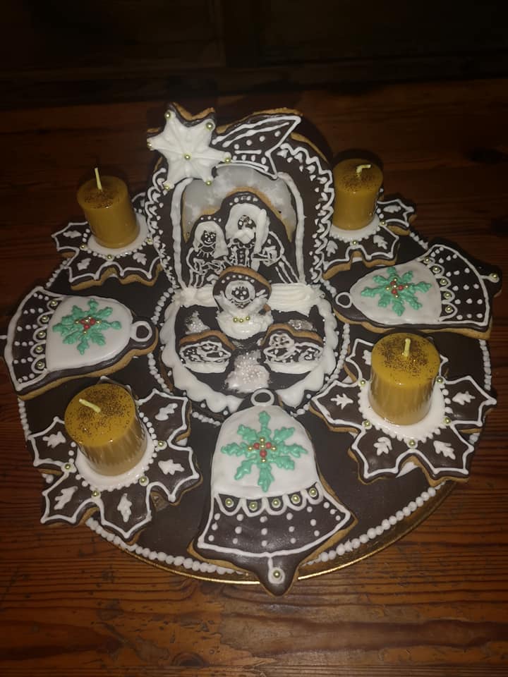 Adventni venček iz medenega testa pa je izdelala tudi lani, le da je uporabila rženo moko, saj kot pravi Suzana, se bela barva lepše vidi na na temni podlagi. Na našo željo je nam zaupala tudi recept, iz katerega so lani nastale tudi jaslice na spodnji sliki.