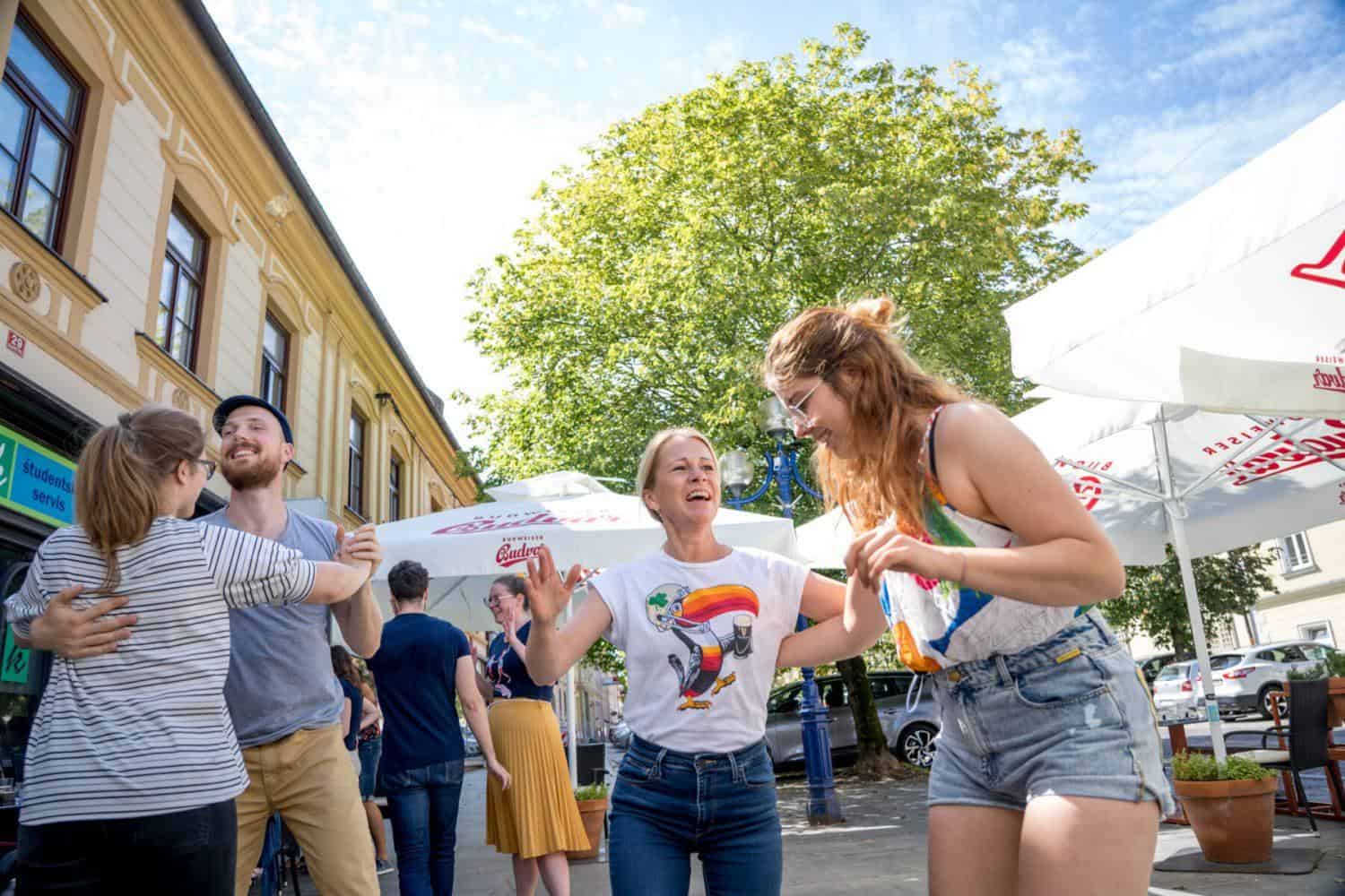 V petek so po enakem konceptu kot so dogodki »poletja v mestu« priredili plesni večer. Izkoristili so prostornost terase in prostora pod teraso hotela Vila Pohorje, kjer so za središče dogajanja razprostrli plesišče. Sobotno dopoldne so obiskovalce pospremili na koncert »Jazz caffe pri Wolfu«, kjer so za glasbeno vzdušje poskrbeli »Pikaja Trio«. In ravno njihovo prisotnost v mestu so izkoristili in jih povabili še na teraso mestne kavarne Ars Cafe. Ob swing repertoarju je minila prva polovica popoldneva, glasba v živo pa je bila pomembna popestritev napovedanega plesnega druženja. Dnevno dogajanje je Mateja pospremila z besedami kako so prišli od ideje do izvedbe: »Ime »Lindy Room« smo si izmislili že pred dvema letoma, ko smo prvič poizkusili privabiti plesalke in plesalce od drugod, da se nam pridružijo že tekom dneva in to je tudi uspelo. »Lindy« je prvi del imena plesa, ki smo se ga do sedaj najbolj učili, »Room« pa je mišljen kot dnevna soba in to je tudi bilo – dnevno druženje ob kavici, brunchu, plesu, soncu. Takšno dopoldne izredno paše v središče mesta in nedvomno bomo to ponovili. Že razmišljamo o decembrskem času, saj je veliko božičnih pesmi primernih za swing plese. Torej kot nalašč za nas in praznično razpoloženje.«