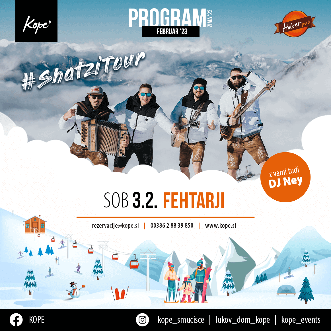 V petek, 3. februarja, od 20. ure dalje začenjajo najbolj nori vikend na Kopah žurerji Fehtarji. Fehtarje, ki se držijo slogana 'Mi smo za polko in za rock'n'roll', sestavlja skupina glasbenikov, ki so že uveljavljena imena slovenske zabavne in narodno-zabavne glasbe. Fantje so v prvi vrsti zelo dobri prijatelji, vsak od njih pa je član svojega primarnega banda. Predvsem pa poskrbijo za daleč najboljši žur.