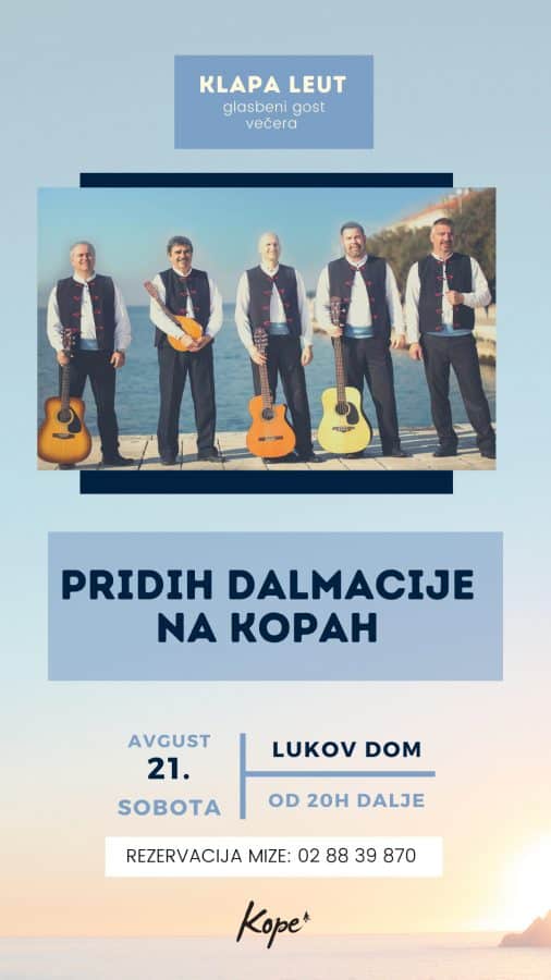 Dogodek, na katerem se boste družili in prepevali dalmatinske pesmi s klapo Leut ter uživali v odločni kulinariki pa v soboto, 21. 8. 2021, pripravljajo tudi na Kopah.
