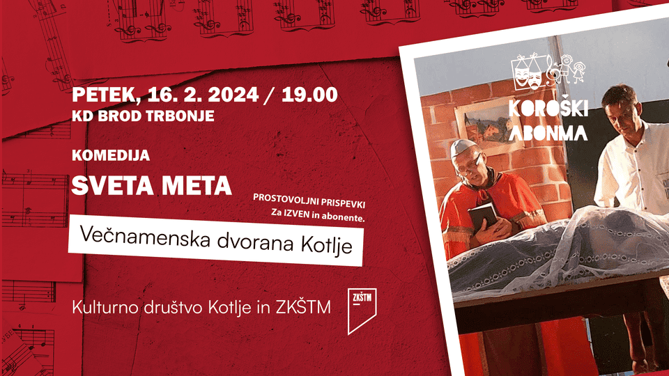 Ta petek, 16. februarja 2024, vas bo v večnamenski dvorani v Kotljah navdušila gledališka skupina KD Brod Trbonje, s komedijo ''Sveta Meta''.