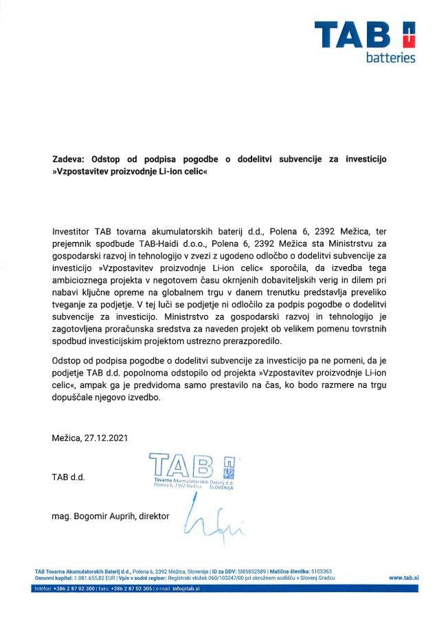 Vlada je v začetku decembra na dopisni seji sklenila, da se v veljavni načrt razvojnih programov 2021-2024 uvrsti nov projekt, imenovan Vzpostavitev proizvodnje Li-ion celic. Vlogi investitorja, tovarne akumulatorskih baterij Tab Mežica, in prejemnika spodbude, družbe Tab-Haidi, je bila odobrena subvencija za naložbo v vzpostavitev proizvodnje litij-ionskih celic, katere vrednost znaša 49,9 milijona evrov. Danes pa so iz podjetja TAB sporočili, da odstopajo od pogodbe.