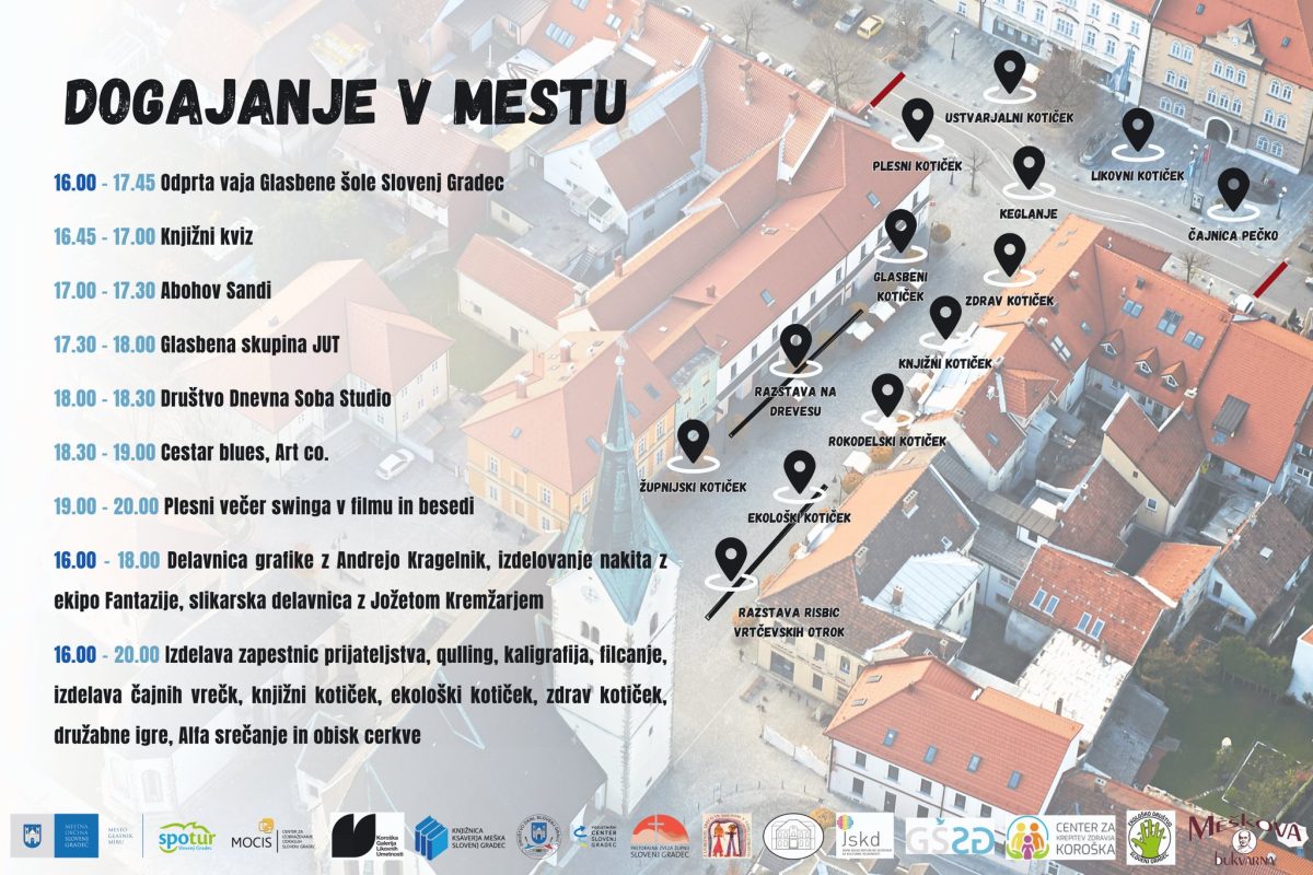 Obiskovalci bodo lahko tokrat doživeli mestno jedro skozi knjižni sejem, odprto vajo glasbenikov, otroške pravljične urice, likovne in rokodelske ustvarjalnosti ter sproščene ulične aktivnosti. Med drugim bo omogočen brezplačen vstop v mestni kino, plesni nastop članov KD Swingradec in odkrivanje mesta skozi manj pričakovane, a posebne izkušnje.