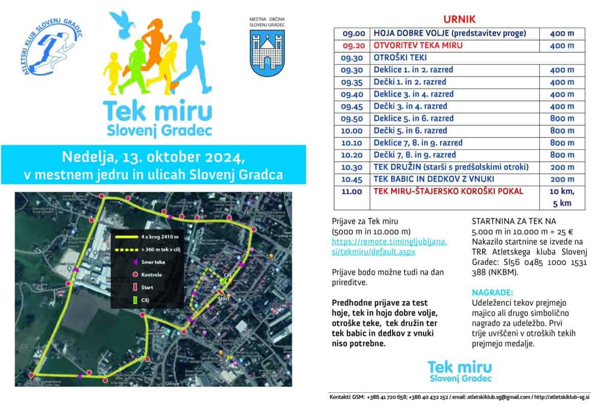 V nedeljo, 13. oktobra, Atletski klub Slovenj Gradec ob podpori Mestne občine Slovenj Gradec že tradicionalno organizira Tek miru, s katerim obeležujejo dan OZN. Ta sicer vsako leto poteka 24. oktobra, v spomin na dan, ko je začela veljati Ustanovna listina Organizacije združenih narodov.