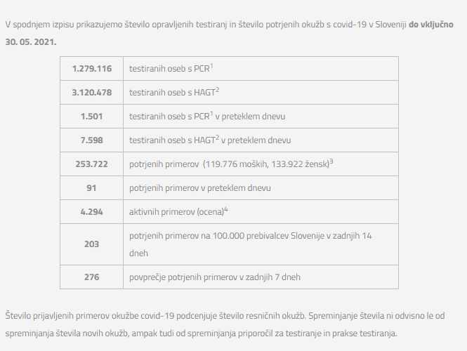 Število opravljenih testiranj in število potrjenih okužb s covidom-19 do vključno 30. 5. 2021: