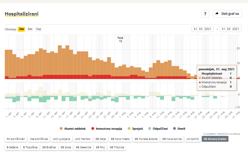 V Splošni bolnici Slovenj Gradec se po zadnjih podatkih Covid-19 sledilnika zdravi en covidni pacient in sicer na oddelku intenzivne terapije. Iz bolnišnice niso odpustili nobenega pacienta. Umrl ni nihče.