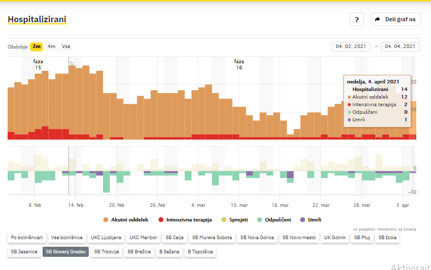Po zadnjih podatkih Covid-19 sledilnika se v Splošni bolnišnici Slovenj Gradec zdravi 14 covidnih pacientov, dva na oddelku intenzivne terapije. V bolnišnično oskrbno niso sprejeli nobenega pacienta s potrjeno okužbo, tudi v domačo oskrbo niso nobenega odpustili. Umrla je ena oseba s potrjeno okužbo.