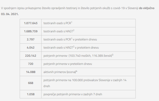 Število opravljenih testiranj in število potrjenih okužb do vključno 3. 4. 2021: