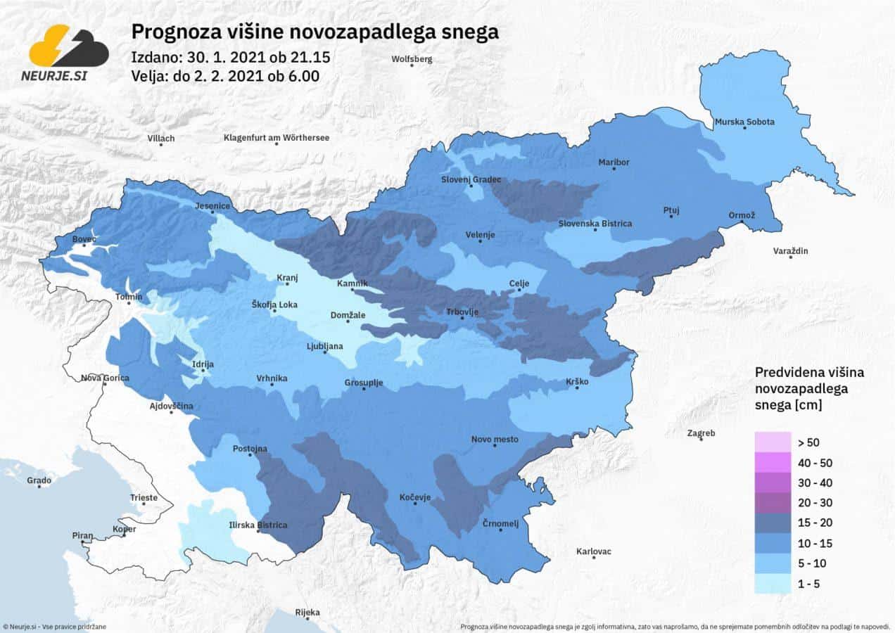 V večjem delu Slovenije bo do noči na ponedeljek zapadlo od 5 do 15 cm snega, ponekod več, ponekod manj. Med posameznimi območji lahko prihaja do večji razlik v višini snežne odeje.
