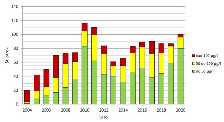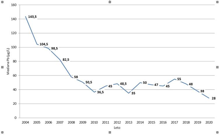 Povprečne vrednosti svinca v krvi triletnih otrok iz Zgornje Mežiške doline so bile v letu 2020 nižje kot v letih pred tem. Delež otrok z visoko vsebnostjo svinca v krvi (100 µg/l in več) je bil v zadnjih dveh letih najnižji od začetka izvajanja meritev. Primerjava mediane vrednosti svinca v krvi triletnikov in števila triletnikov iz Zgornje Mežiške doline, glede na vrednost svinca v krvi od začetka merjenja, so prikazane na spodnjih grafih.