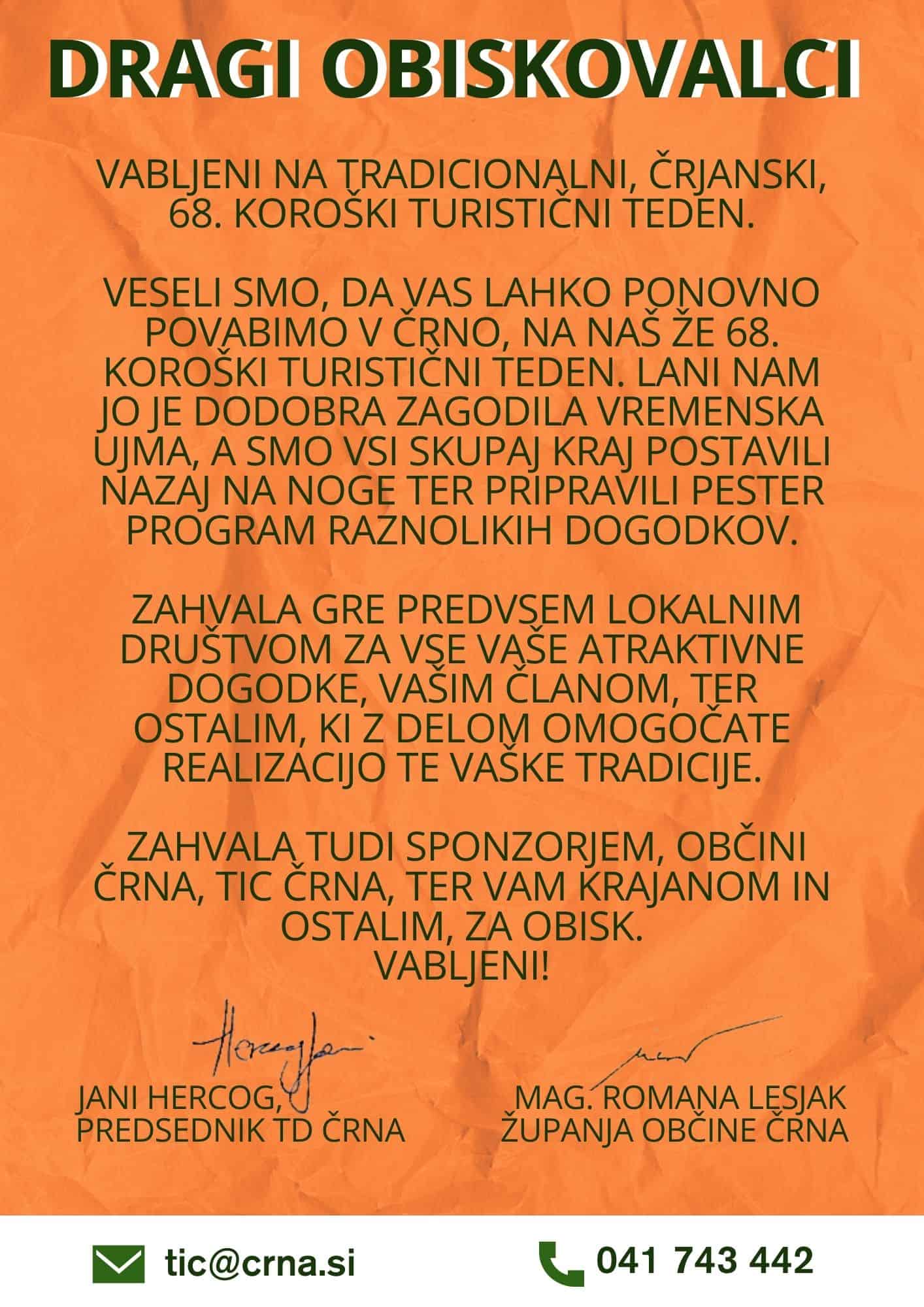 Organizatorji, Turistično društvo Črna in Občina Črna na Koroškem, so izjemno veseli, da lahko ponovno povabijo obiskovalce v Črno na njihov že 68. koroški turistični teden. Lansko leto jim je načrte prekrižala vremenska ujma, vendar so skupaj z lokalno skupnostjo uspeli ponovno postaviti kraj na noge in pripraviti pester program raznolikih dogodkov.