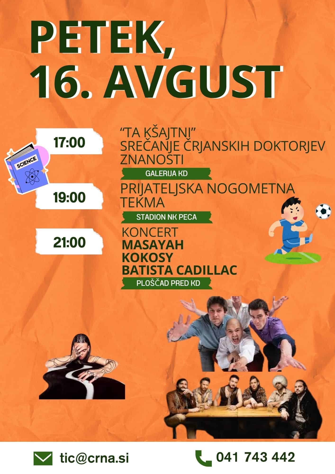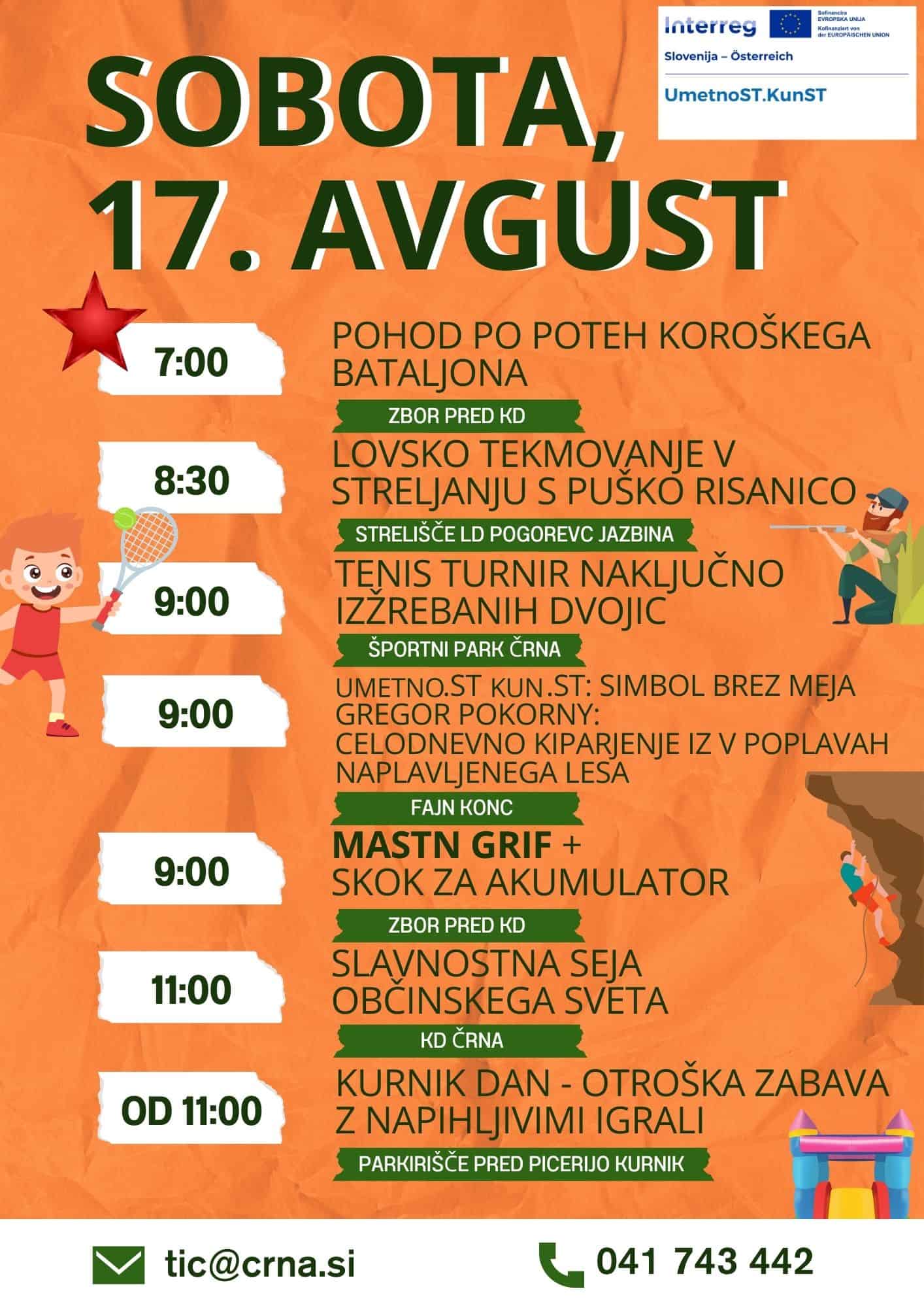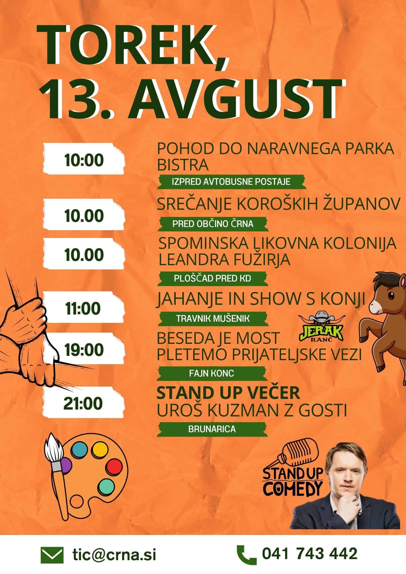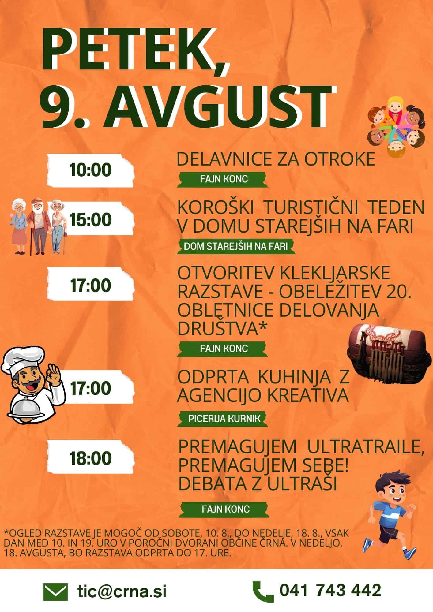 - 10.00 uri otvoritev razstave Društva upokojencev Črna, skupina Alenčice (ogled razstave bo možen v ponedeljek 12., torek 13. ter četrtek 15. avgusta med 11.00 ter 18.00 uri v prostorih DU KD Črna na Koroškem)