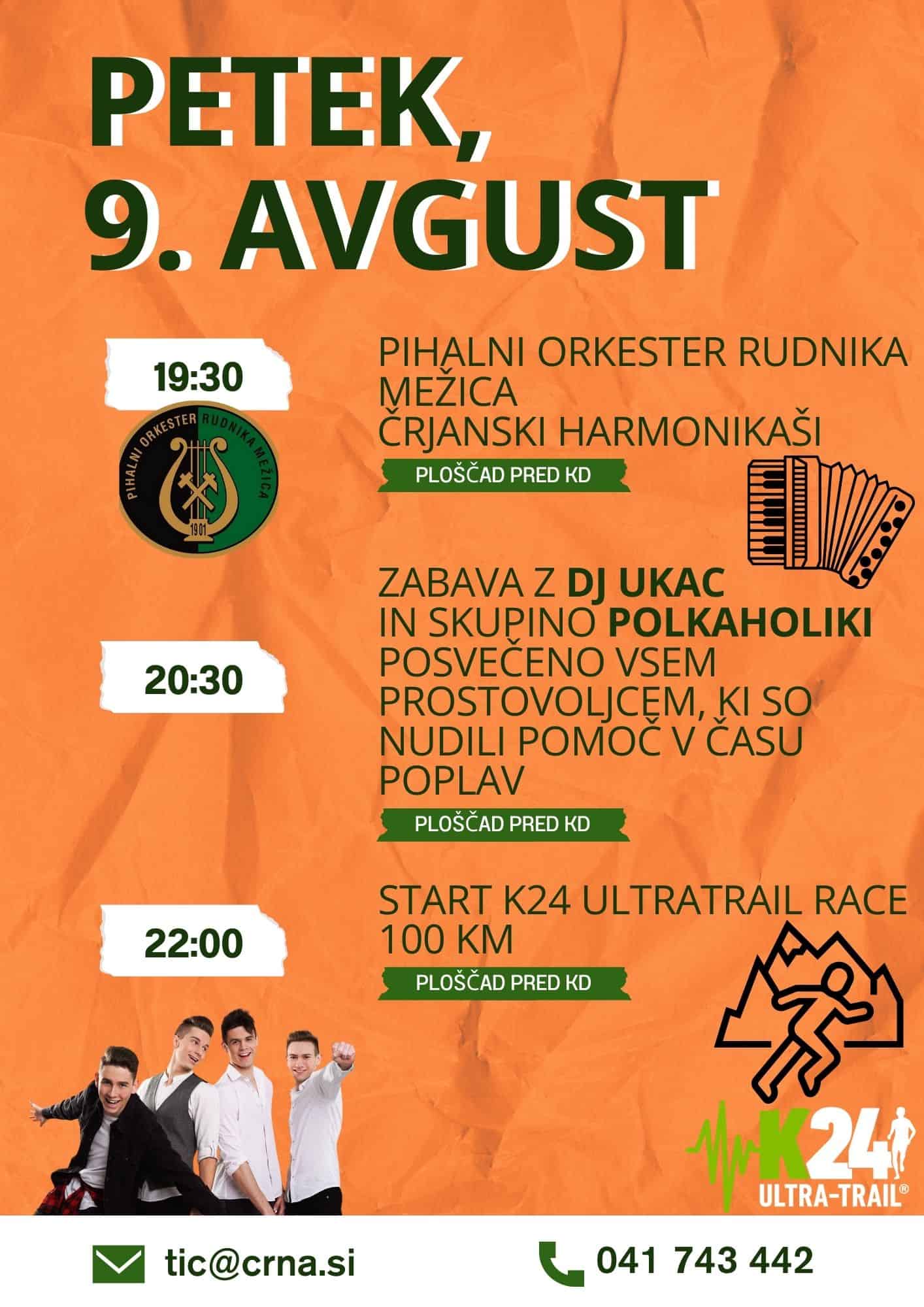 - 20.30 uri zabava z DJ Ukac ter skupina Polkaholiki. Zabava bo posvečena vsem prostovoljcem, ki so nudili pomoč v času poplav, na ploščadi pred KD