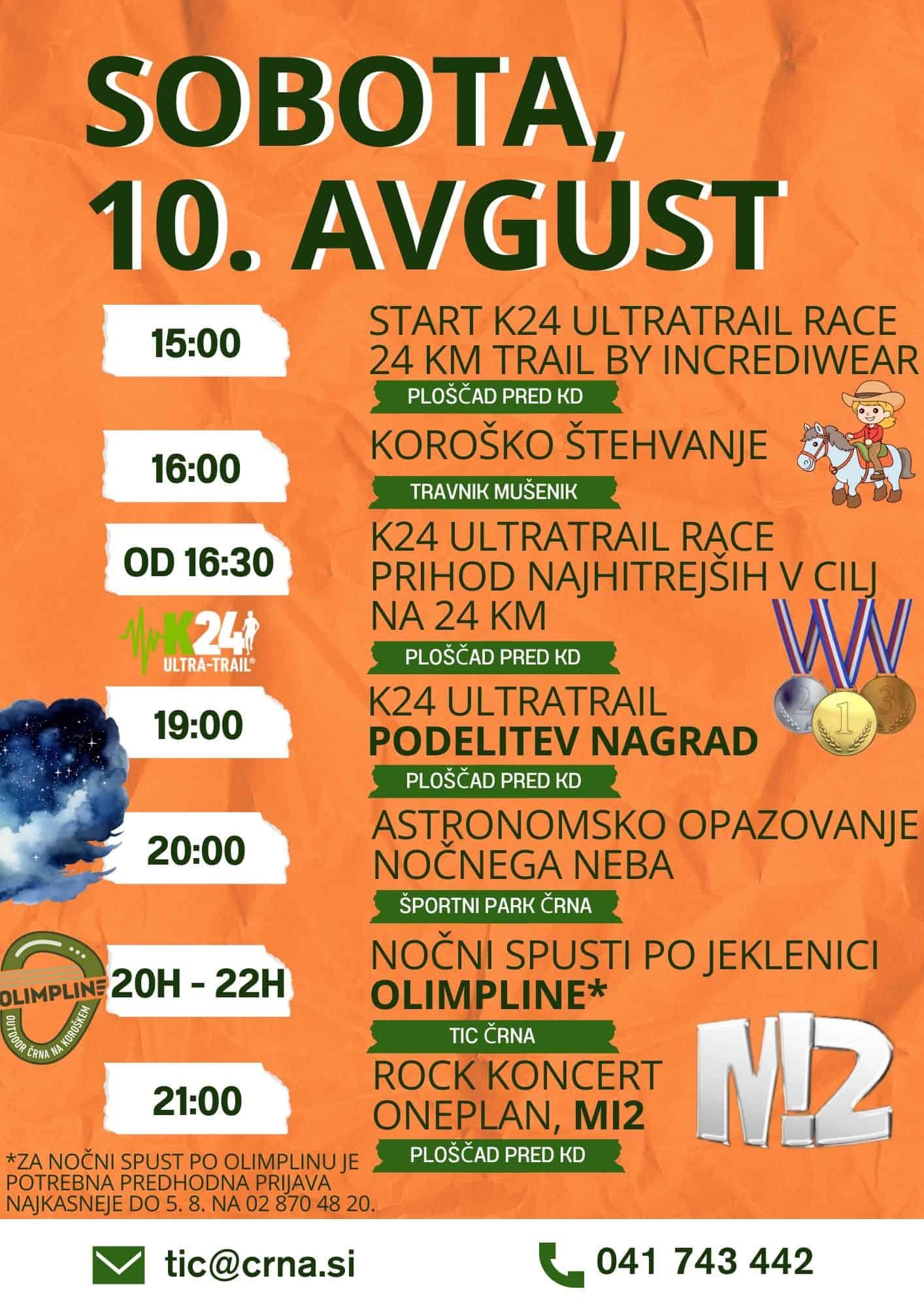 - od 20.00 ure do 22.00 ure nočni spust po jeklenici Olimpline (potrebna prehodna prijava, najkasneje do 12. avgusta na 02 870 48 20 TIC Črna na Koroškem)
