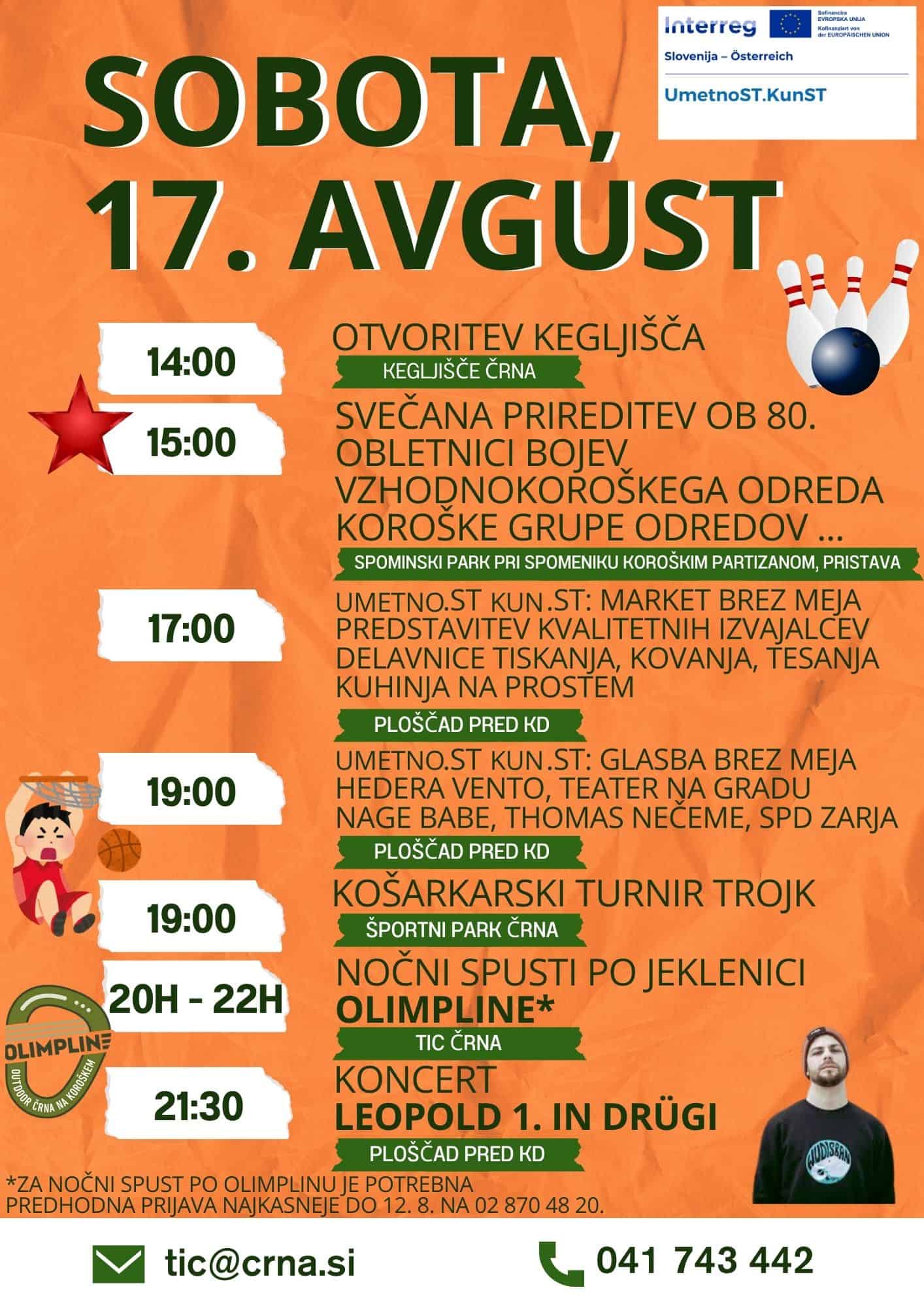 - 20.00 - 22.00 uri nočni spust po jeklenici Olimpline (potrebna prehodna prijava, najkasneje do 5. avgusta na 02 870 48 20 TIC Črna na Koroškem)