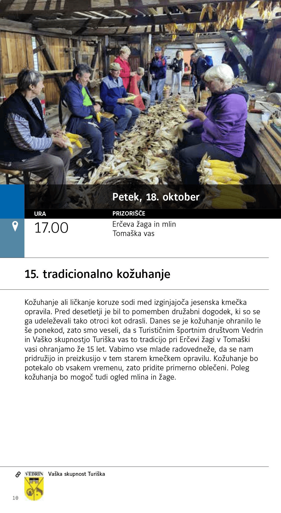 Koroški pokrajinski muzej, Muzej Slovenj Gradec, Turistično športno društvo Vedrin in Vaška skupnost Turiška vas vas vabijo na tradicionalno kožuhanje koruze, ki bo potekalo v petek, 18. oktobra 2024, ob 17. uri pri Erčevi žagi in mlinu v Tomaški vasi.