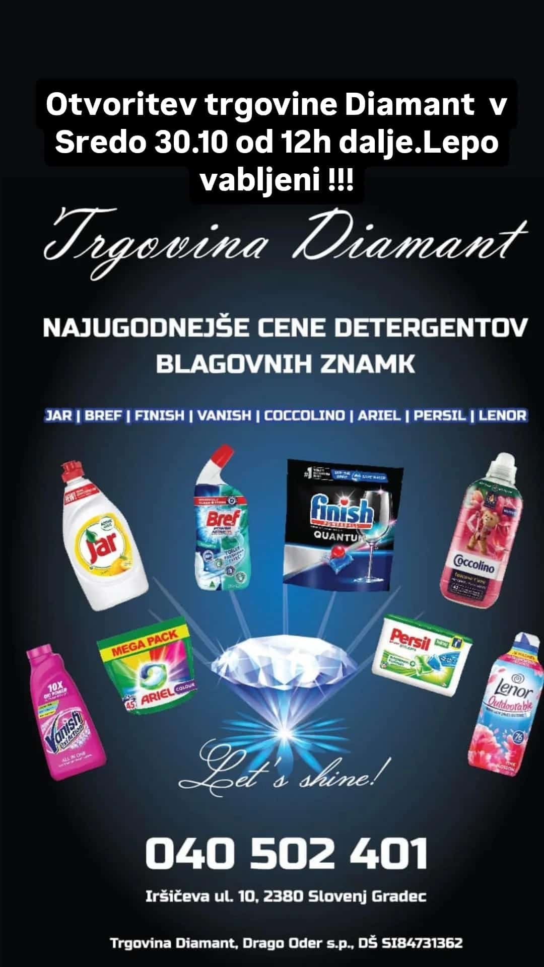 Trgovina Diamant bo poskrbela, da bodo čistila, detergenti, pralni praški in mehčalci vedno na dosegu vaših rok in to po neverjetnih, ugodnih cenah.