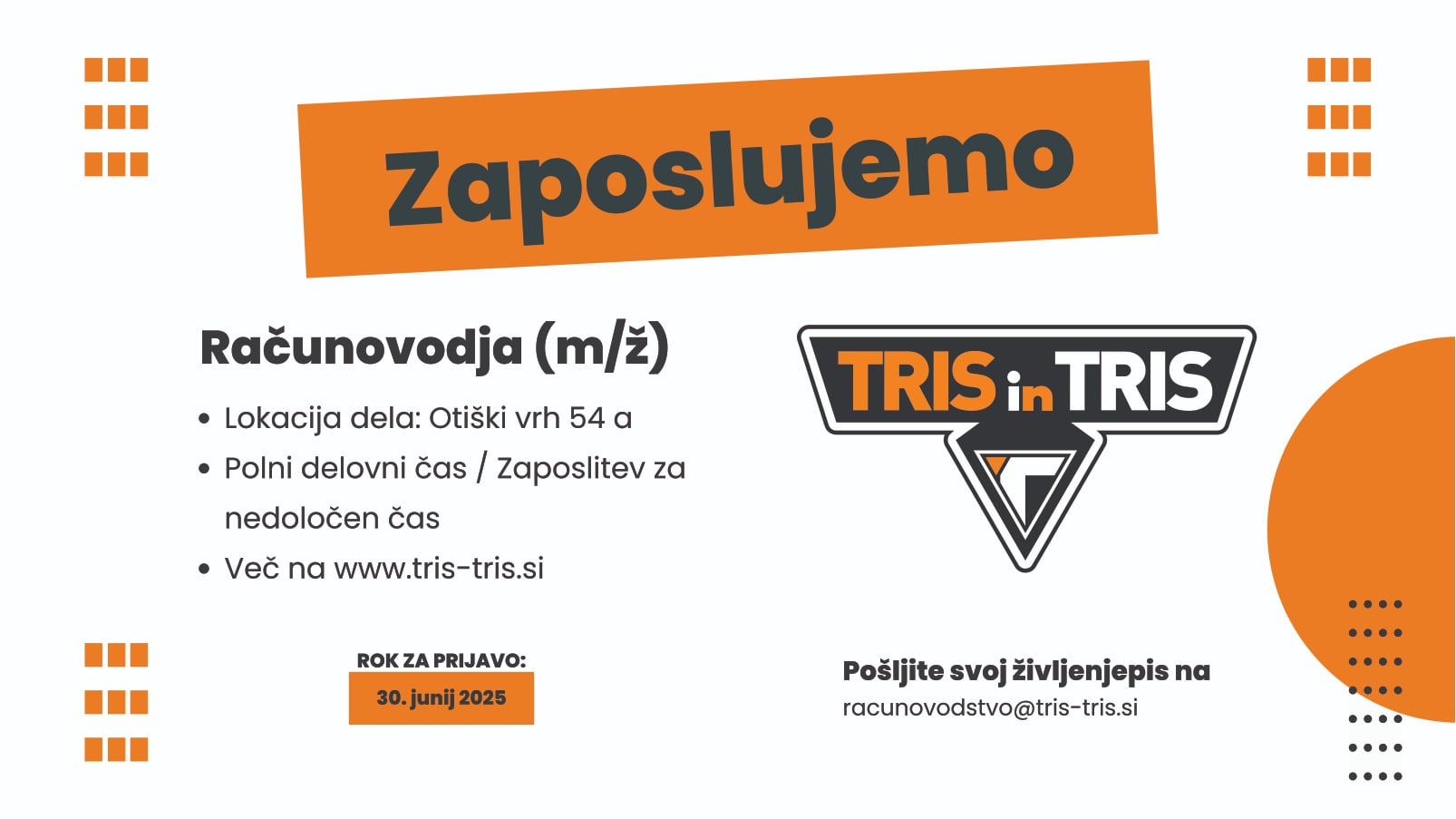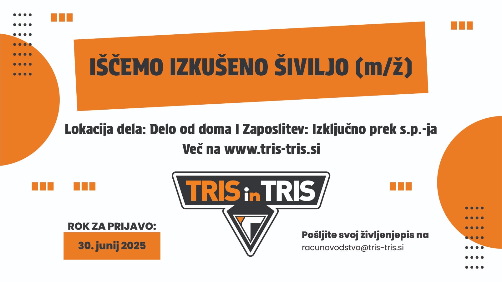 Če se prepoznate v opisu, pošljite svoj življenjepis na: racunovodstvo@tris-tris.si, rok za prijavo je vse do 30. junija 2025. Za več informacij jih lahko pokličete na 02 87 87 220 ali obiščete njihovo spletno stran.
