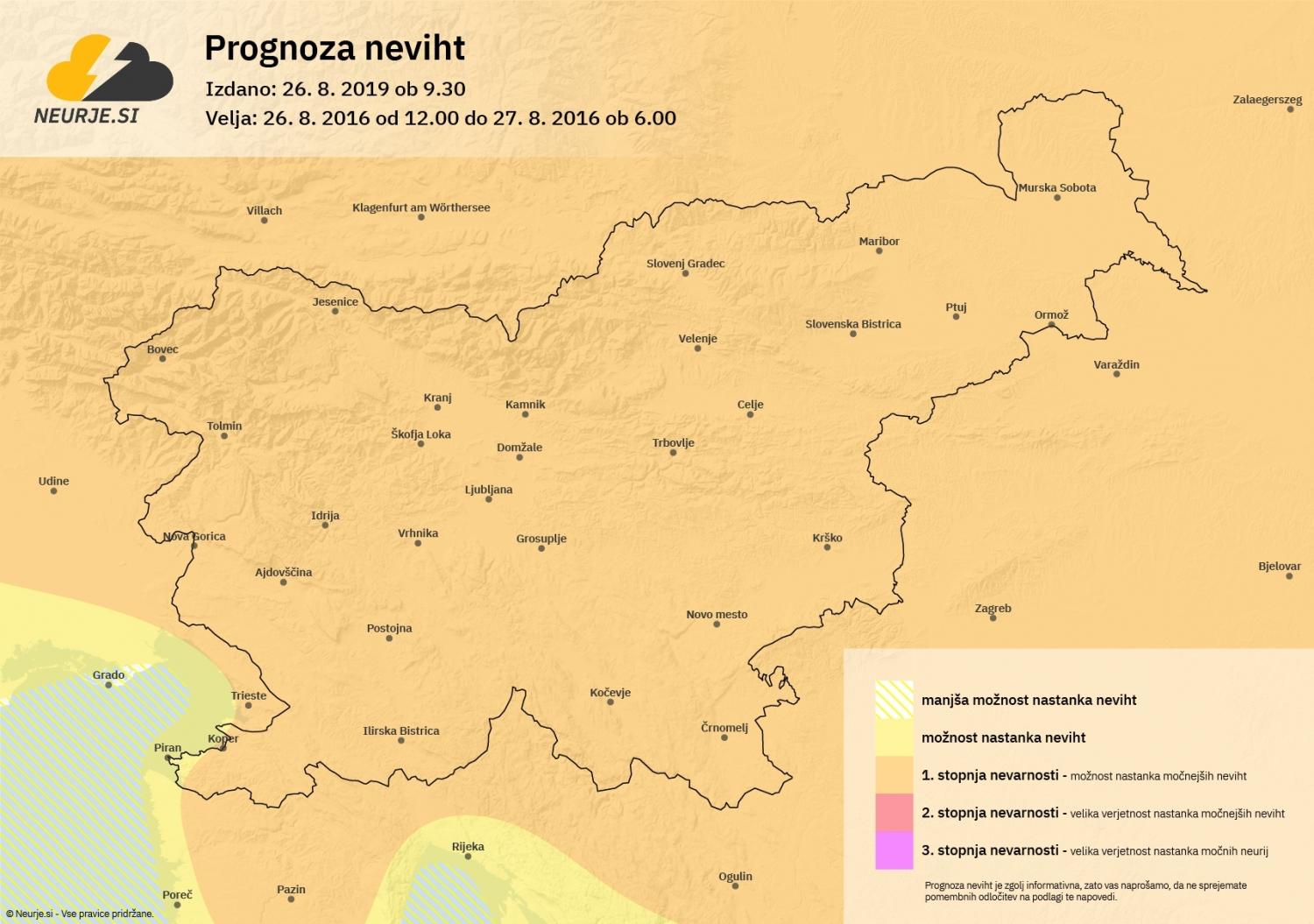 Razpoložljive konvektivne potencialne energije se bo tekom dneva zaradi vlažne zračne mase pri tleh in dnevnega segrevanja nabralo dovolj tudi za nastanek močnejših neviht z intenzivnimi in dolgotrajnimi nalivi, močnejšimi sunki vetra in točo. Ob morebitnem nastanku kakšne močnejše stacionarne nevihte so lokalno možni hitri porasti hudournikov in manjših vodotokov ter hudourniške poplave, predvsem na nekraških območjih, kjer padavinska voda površinsko odteka.
