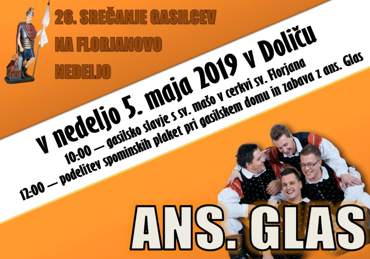 Prostovoljno gasilsko društvo Dolič-Šentflorjan pa vas vabi na tradicionalno, letos že 26. Srečanje gasilcev ob Florjanovi nedelji v Doliču. Prireditev bo potekala v nedeljo, 5. maja 2019, ko bo 15 minut pred 10. uro proti cerkvi sv. Florjana v Doliču krenila gasilska parada, nato sledi maša, po maši skromna pogostitev, nato pa se dogajanje preseli pred gasilski dom v Doliču, kjer vas bo po kratki slovesnosti zabaval ansambel Glas.