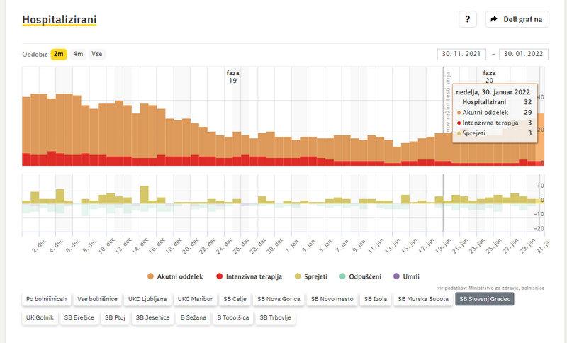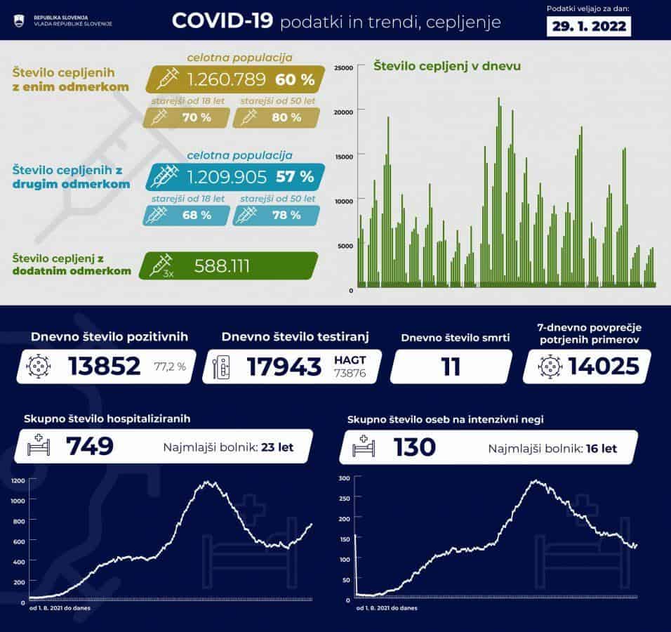 Po zadnjih podatkih vlade v bolnišnicah zdravijo 749 covidnih bolnikov, dan prej 726, od tega 130 na intenzivni negi, dan prej 124. Umrlo je 11 covidnih bolnikov. Po podatkih sledilnika v SB Slovenj Gradec zdravijo 32 covidnih bolnikov. Od teh 3 potrebujejo intenzivno zdravljenje. Na novo so v bolnišnico sprejeli 3 osebe.
