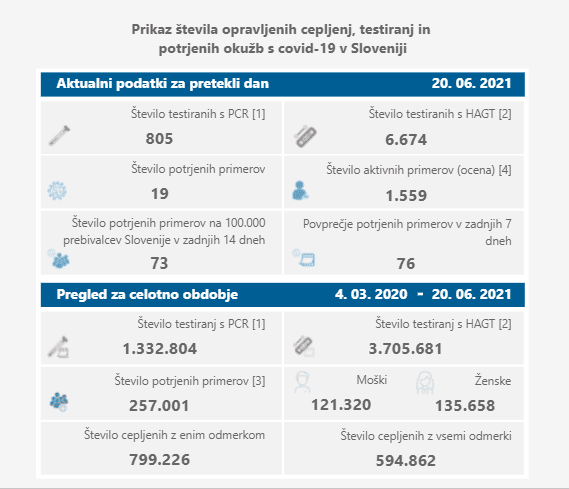 Število opravljenih testiranj in število potrjenih okužb s covidom-19 do vključno 20. 6. 2021:
