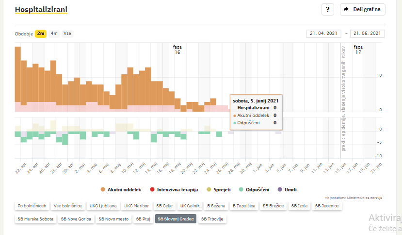 Po zadnjih podatkih Covid-19 sledilnika v Splošni bolnišnici Slovenj Gradec ne zdravijo nobenega covidnega pacienta. Nazadnje so imeli hospitaliziranega bolnika s potrjeno okužbo v soboto, 5. junija 2021.