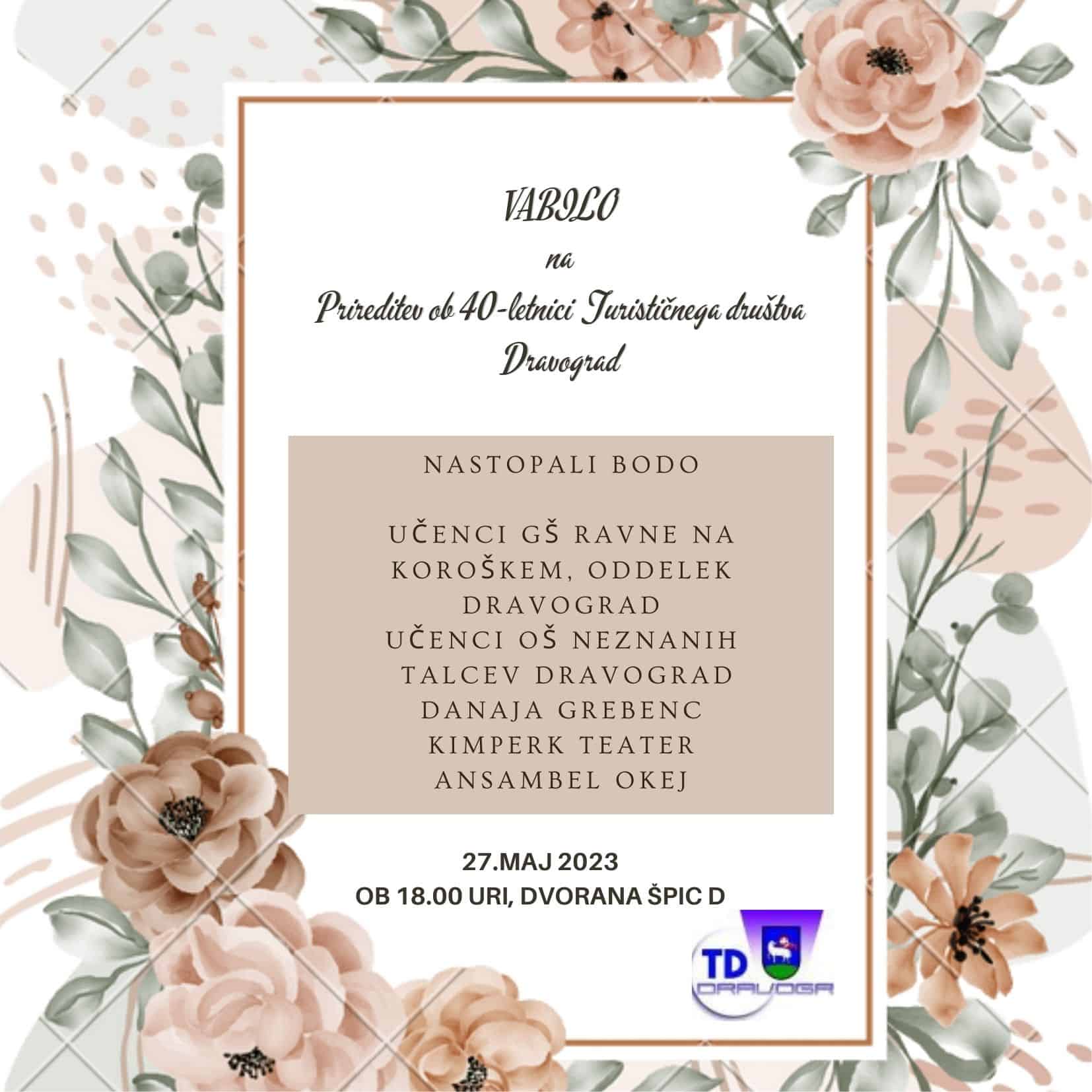Takole pa je ob jubileju zapisal Župan Občine Dravograd Anton Preksavec: "Vaše društvo letos praznuje častitljivo 40. obletnico svojega delovanja. Od svoje ustanovitve leta 1983 pa do danes je društvo naredilo ogromno dobrega na področju oživljanja turizma v Dravogradu in okolici, predvsem na promociji lepot narave in kulture naše občine. Hvala vam za vso vaše prostovoljno delo v vseh teh letih, za številne dobre projekte in vašo željo po promociji najlepšega kar imamo. Naše občine in naše koroške tradicije. Želim še veliko uspešnih let delovanja z željo, da bo naše sodelovanje še samo boljše."