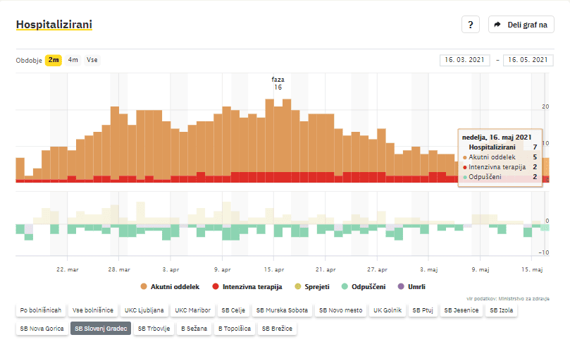 V Splošni bolnišnici Slovenj Gradec se po zadnjih podatkih Covid-19 sledilnika zdravi 7 covidnih bolnikov, dva na oddelku intenzivne terapije. V domačo oskrbo odpustili dve osebi. Umrl ni nihče.