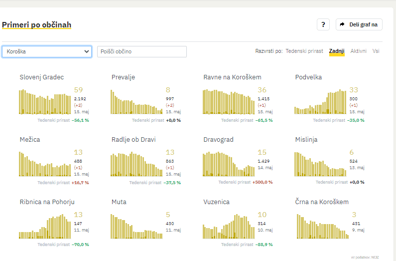Slovenj Gradec 2, Prevalje 2, Ravne na Koroškem 1, Podvelka 1, Mežica 1, Radlje ob Dravi 1.