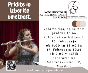 Spoštovani starši, dragi učenci, zagotovo vas bega veliko vprašanj, dilem in razmišljanj. Z veseljem in odkrito vam bodo na Konservatoriju za glasbo in balet Maribor odgovorili na vaša vprašanja na informativnih dnevih, ki bosta potekala v petek, 16. februarja 2024, ob 9.00 in 15.00 uri, ter v soboto, 17. februarja 2024, ob 9.00 uri, v koncertni dvorani konservatorija na Mladinski ulici 12 v Mariboru.