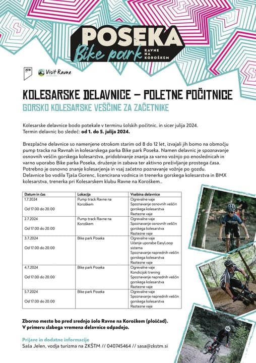 Za mladino, med 8. in 12. letom starosti so tudi letos pripravili brezplačne kolesarske delavnice v terminu šolskih počitnic. Od 1. do 5. julija 2024, bodo delavnice izvajali na območju Pump tracka na Ravnah in kolesarskega parka Bike park Poseka.