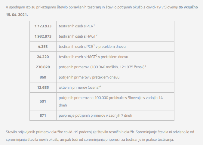 Število opravljenih testiranj in število potrjenih okužb s covid-19 v Sloveniji do vključno 15. 04. 2021.