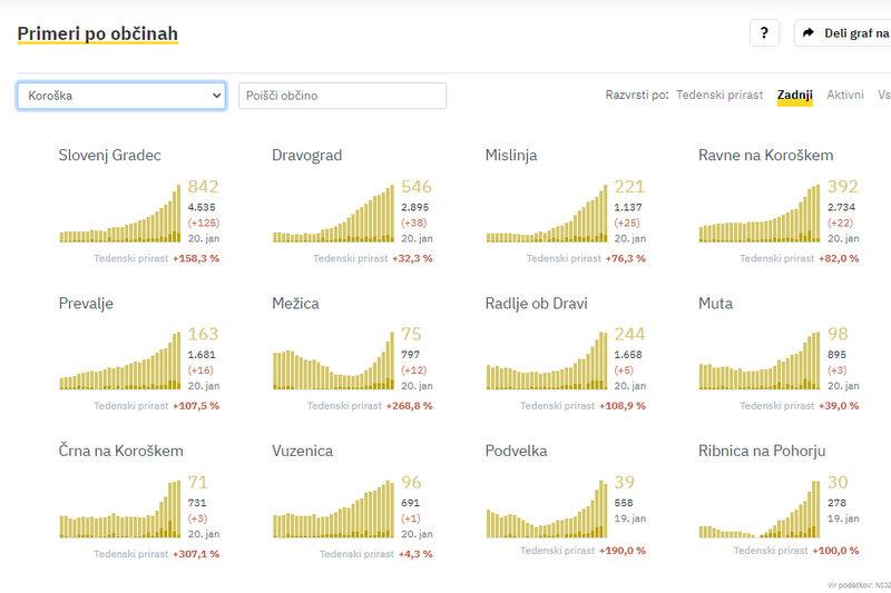 Na Koroškem so včeraj nove okužbe potrdili v desetih občinah. Skupno so jih zabeležili 250, dan pred tem 385, pred tednom dni pa 184. V Slovenj Gradcu so jih včeraj potrdili 125, v Dravogradu 38, v Mislinji 25, na Ravnah na Koroškem 22, na Prevaljah 16, v Mežici 12, v Radljah ob Dravi 5, na Muti 3 in v Črni po 3, v Vuzenici 1.